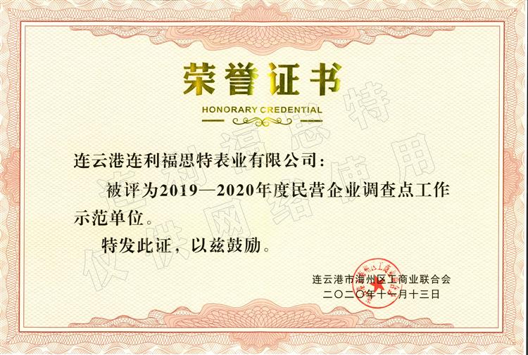 近日,連云港連利福思特表業(yè)有限公司榮獲“2019-2020年度民營企業(yè)調查點工作示范單位”稱號。 民營企...